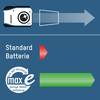 • Porównanie baterii 'Max e': Standardowa bateria NiMH rozładowuje się do 1/5 w ciągu 12 miesięcy; 'Max e' pozostaje w pełni naładowana w tym samym okresie.